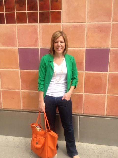 Andrea wore: “I just wore this outfit this past Sunday for “family fun day” when we went down to the California Science Center to see the Endeavor Space Shuttle! These are my favorite pair of Hudson Jeans, that I finally can fit into again! Little secret – I gained 10 lbs and couldn’t get these puppies on 3 months ago!! But I’ve lost the 10 lbs and all is right with the world again. The green blazer is actually almost a sweatshirt material and super soft. It’s from one of my favorite places to score great deals, Nordstrom Rack. My Tory Burch chain necklace was also a steal I found at Nordstrom Rack. The plain white t-shirt is from Target. My orange Lancaster Paris bag is perfect for day tripping with the kids is from and of course on my feet are my Tieks.”