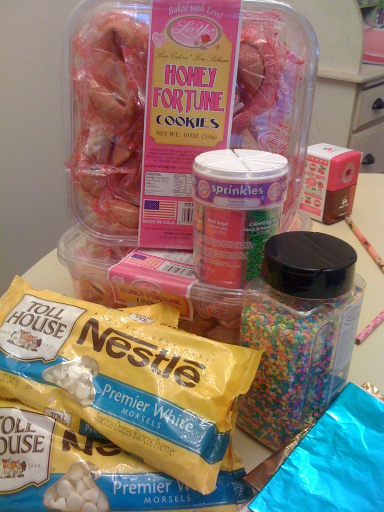 Where do you buy Fortune cookies? Smart & Final or Costco Where do I buy the foil? Micheals Then all you need is white chocolate chips, shortening and sprinkles.